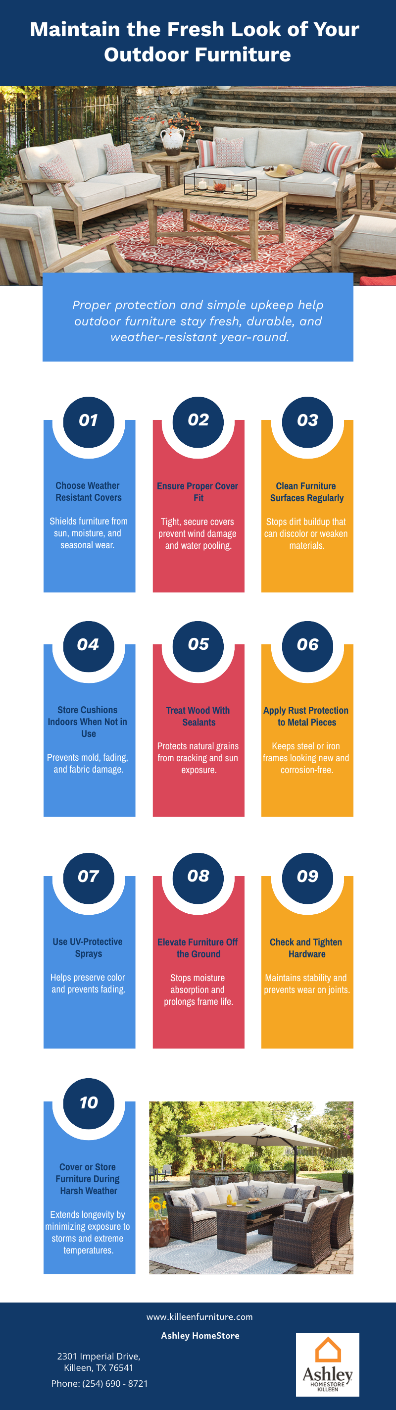 Maintain The Fresh Look Of Your Outdoor Furniture November 20, 2025 centexseoadmin Outdoor Furniture Killeen VIEW PDF Outdoor Furniture Please Share This Tweet Share Plus one Pin It Related Posts Outdoor Table Ideas The choices available in the category of outdoor tables are endless and you can buy… How To Clean Your Patio Furniture View Full Image Tips For Choosing Patio Furniture Make your outdoors as comfortable and inviting as indoors by choosing the right patio furniture.…